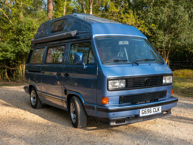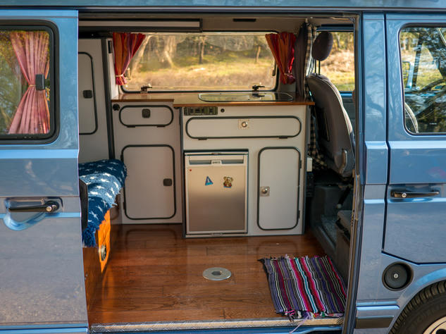 She started her life as a fairly high spec multivan and comes with some nice goodies such as power steering, central locking and big electric mirrors. At the back it features a 1.6 Turbo Diesel (JX) power plant able to propel her forward to a respectable 85Mph (in favourable wind). However, in reality, a comfortable cruising speed is around 65Mph. Does it feature a 5th gear? I hear you cry. Yes it does! 5th gear, alloy wheels and all the blue glittery paint you could throw at it. So, all in all, for a T3, she’s quite a well pimped ride.