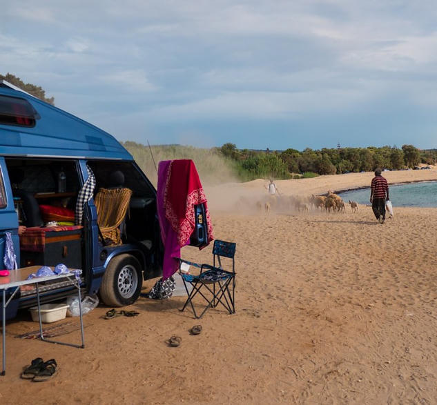 Tholos turned out to be a very cool dude. He didn’t speak much English other than few odd words but this didn’t discourage him from having a good, long chat with us. Sometimes resorting to drawing things with sticks on the sand we talked about fruit, girlfriends, motorbikes, good camping locations and the Greek economy. As to the latter his favorite saying was “no job, no problem!”. With Tholos the glass was always half full. Living just round the corner he’d come and visit us every evening, always bringing something good with him. Once he brought us fresh figs, then some beer and when I foolishly went swimming with the last pouch of tabacoo in my pocket, drawning it in the process, Tholos came to the rescue stuffing my smoking box with golden virginia. One evening he tought us some Greek. Simple but useful stuff such as counting to 10 and asking how much the beer costs. We noted it all down in a notepad which I’ve been using as my Greek conversational guide ever since. More than anything Tholos brough us good, happy vibes and that always counts the most. At some point as we were chilling, an unexpected transit of sheep swept through the beach, which made us feel like we’re in India already.
