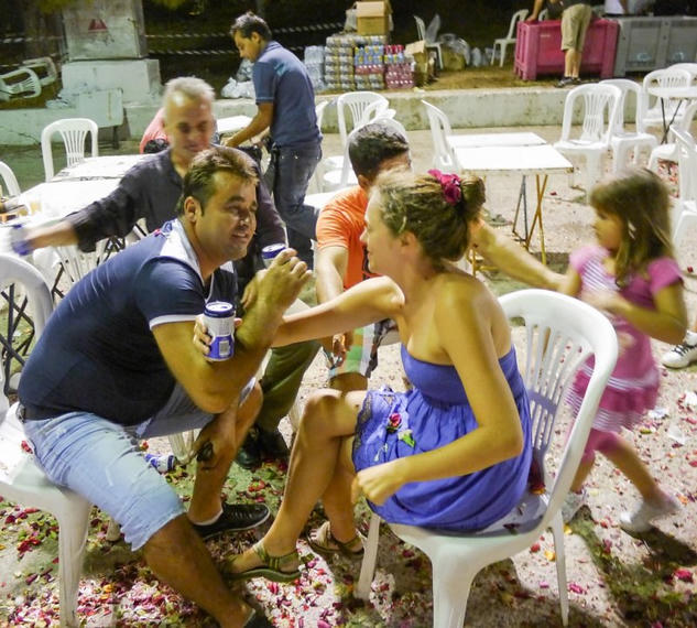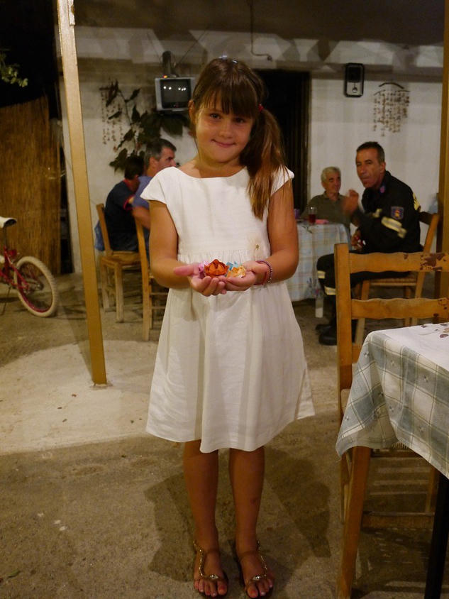 One afternoon we stopped by at the family run taverna to buy some tobacco and ended up staying the afternoon drinking the home made wine, chatting, drawing pictures and making origami flowers with the kids. We returned to the taverna on the Friday night for a meal. The family were all dressed up for a party in a nearby town. We ended up following them to the party in Petalidi for a night of Greek dancing, music and lots of fun…